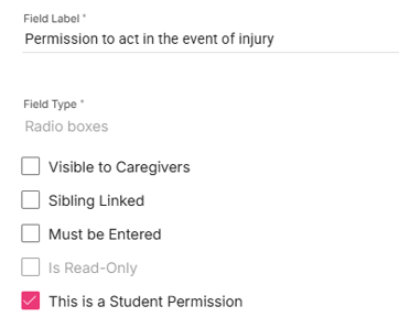 To flag a field for potential inclusion in an event, go to Manage Fields and click EDIT on the desired field. Click to tick ‘This is a Student Permission’ and save the field.