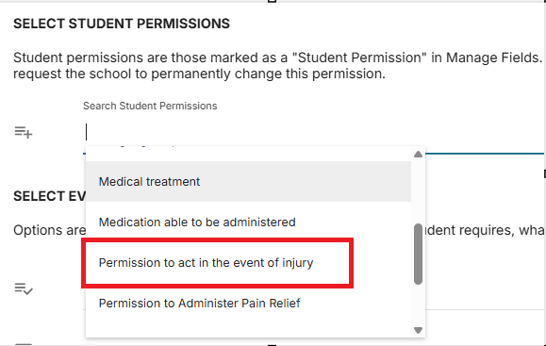 Student Permissions are fields that are included as part of the standard student information, that you may wish to include in an event e.g. EOTC Trip Permission, Permission to act in the event of injury. You would only add these to the event if the caregiver was able to change the option for the purposes of that event.