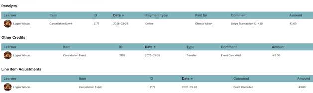 On the occasion of an event being cancelled that already has associated line items and/or payments, the Calendar & Excursions feature will now automatically handle the reversal of finance transactions in the following manner.