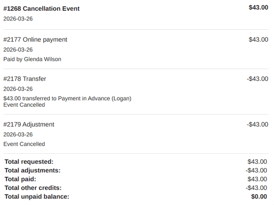 - Line Items attached to the event are identified and any payments made will be automatically transferred to Payment in Advance. Note: refunds will not be processed.