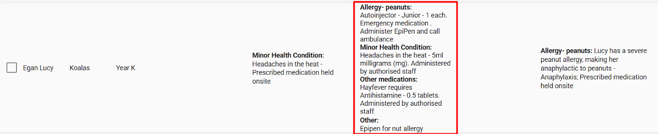 If linked to a medical condition, the medical condition label will prefix the medication details. If not linked, ‘Other: ‘ is used. The unit of measure, dose, administered by and administration detail are included alongside the medication name.